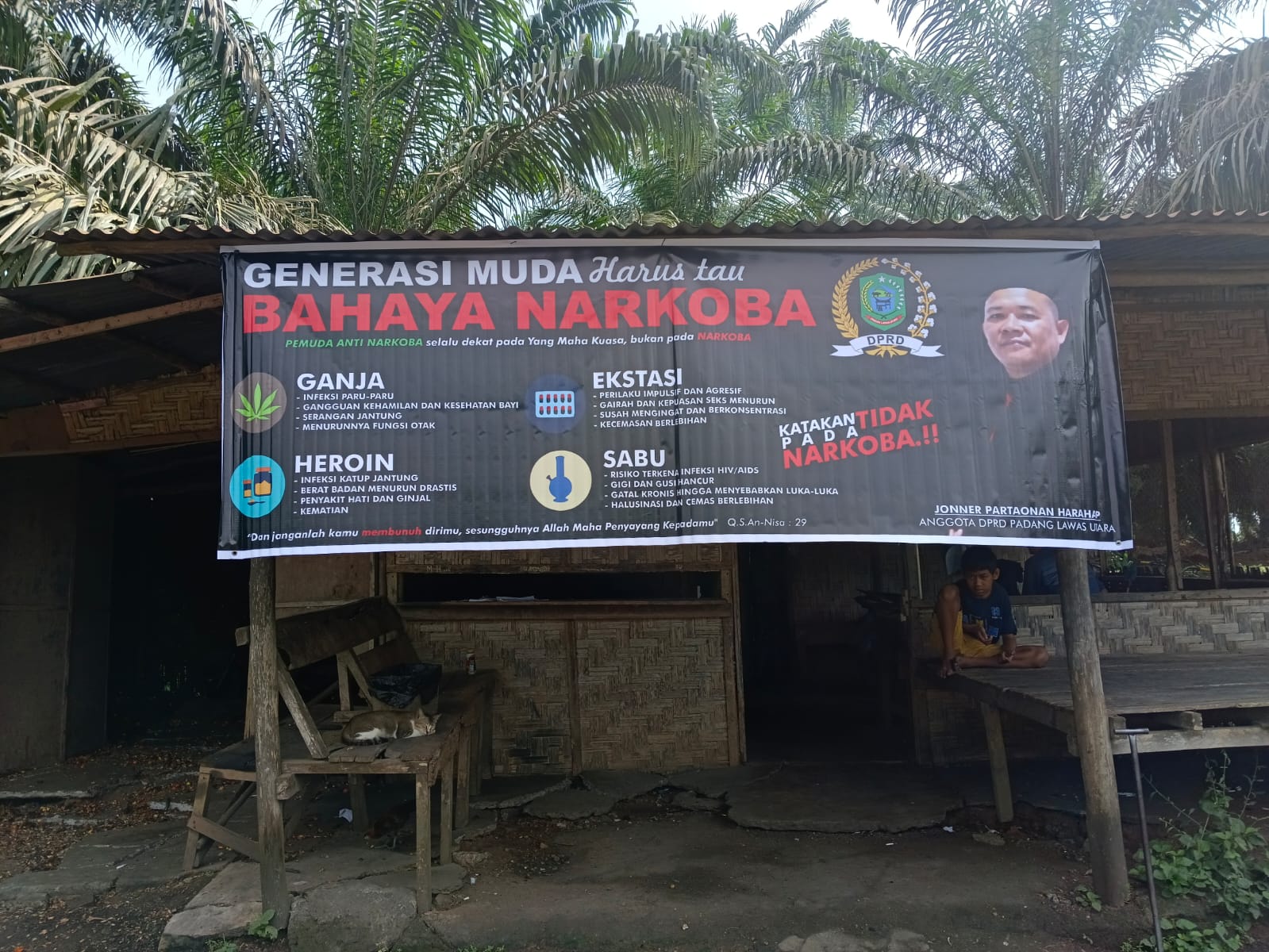 “Katakan tidak pada narkoba!!! Dan janganlah kamu membunuh dirimu, sesungguhnya Allah Maha Penyayang kepadamu, Al Qur’an Sura An Nisa ayat 29,” imbuh Jonner Partaonan Harahap.