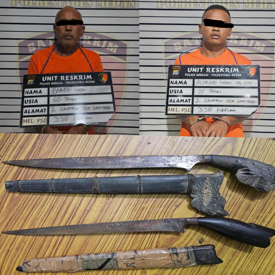 Para tersangka adalah BK (60), beserta seorang anaknya AK alias E (31). Mereka diduga melakukan pembunuhan terhadap Matius Ginting (44), seorang wiraswasta yang beralamat di Dusun II Desa Sukamaju.